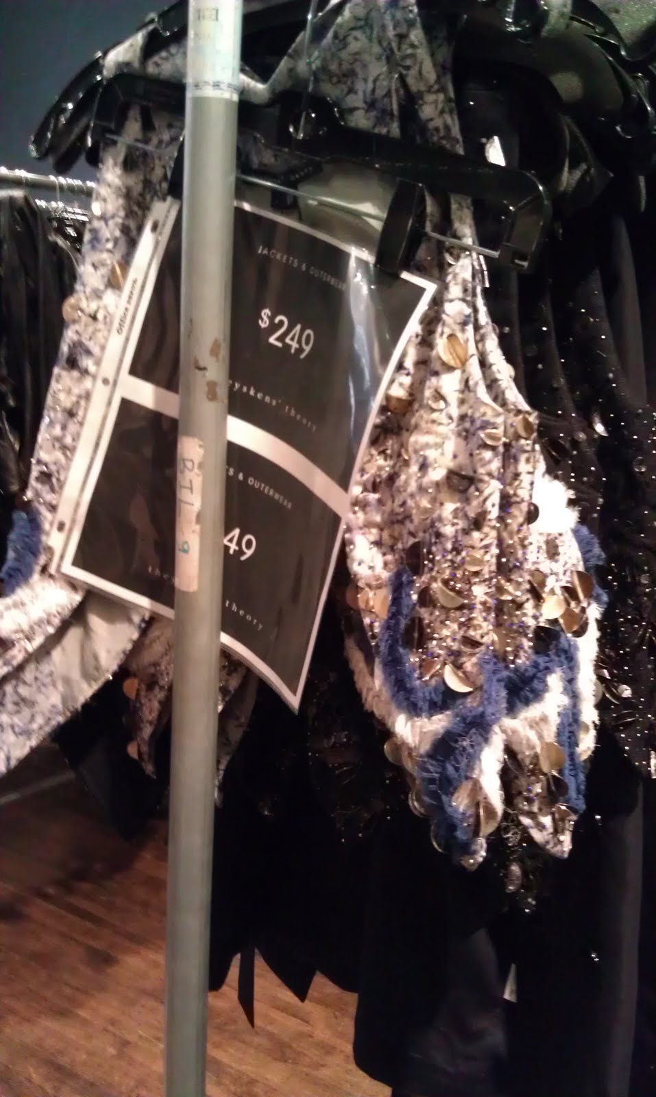 Stopped by the Theysken’s Theory and Helmut Lang Sample Sale on Saturday morning to a completely serene shopping experience. Maybe because it was just after 11am and people weren’t awake yet for some to shop? The sale was neat and spacious with row upon row of orderly racks. There were only about 3 other shoppers perusing the racks as I admired the gorgeous clothing and shoes by Olivier Theyskens. My attention first was to the shoe area where Boots and Pumps are going for $149 a pop and flats are $99. Sizes ranged from 35.5 to 40 with the majority of sizes being in the 37-39 range. My particular fave were the velvet wedges and the X-strap wedges seen so prominently on the debut runway. If you are a size 35 like myself you wan’t have any luck in the shoe area.